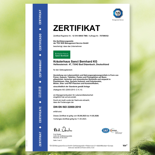 Im Kräuterhaus Sanct Bernhard sind Sicherheit und Qualität der Lebensmittel ein wichtiger Bestandteil der Unternehmenspolitik. Über unsere Rolle in der Lebensmittelkette sind wir uns bewusst. Um der Verantwortung bei der Herstellung unserer Produkte nachzukommen, ist eine genaue Analyse und Bewertung von denkbaren Gefahren und Risiken in allen Prozessen erforderlich, ebenso wie die Beachtung und Einhaltung der festgelegten Vorgaben und Maßnahmen, einschließlich deren Prüfung anhand messbarer Kriterien. Zur Gewährleistung der hohen Anforderungen an Qualität und Sicherheit unserer Produkte haben wir Programme zur Vorsorge sowie Maßnahmen und Pläne zur Lenkung und Kontrolle der Lebensmittelsicherheit erstellt. Dabei ist zum einen die Einhaltung der rechtlichen Vorschriften und zum anderen die Erfüllung unserer hohen Ansprüche an Qualität und Lebensmittelsicherheit für uns eine Selbstverständlichkeit.