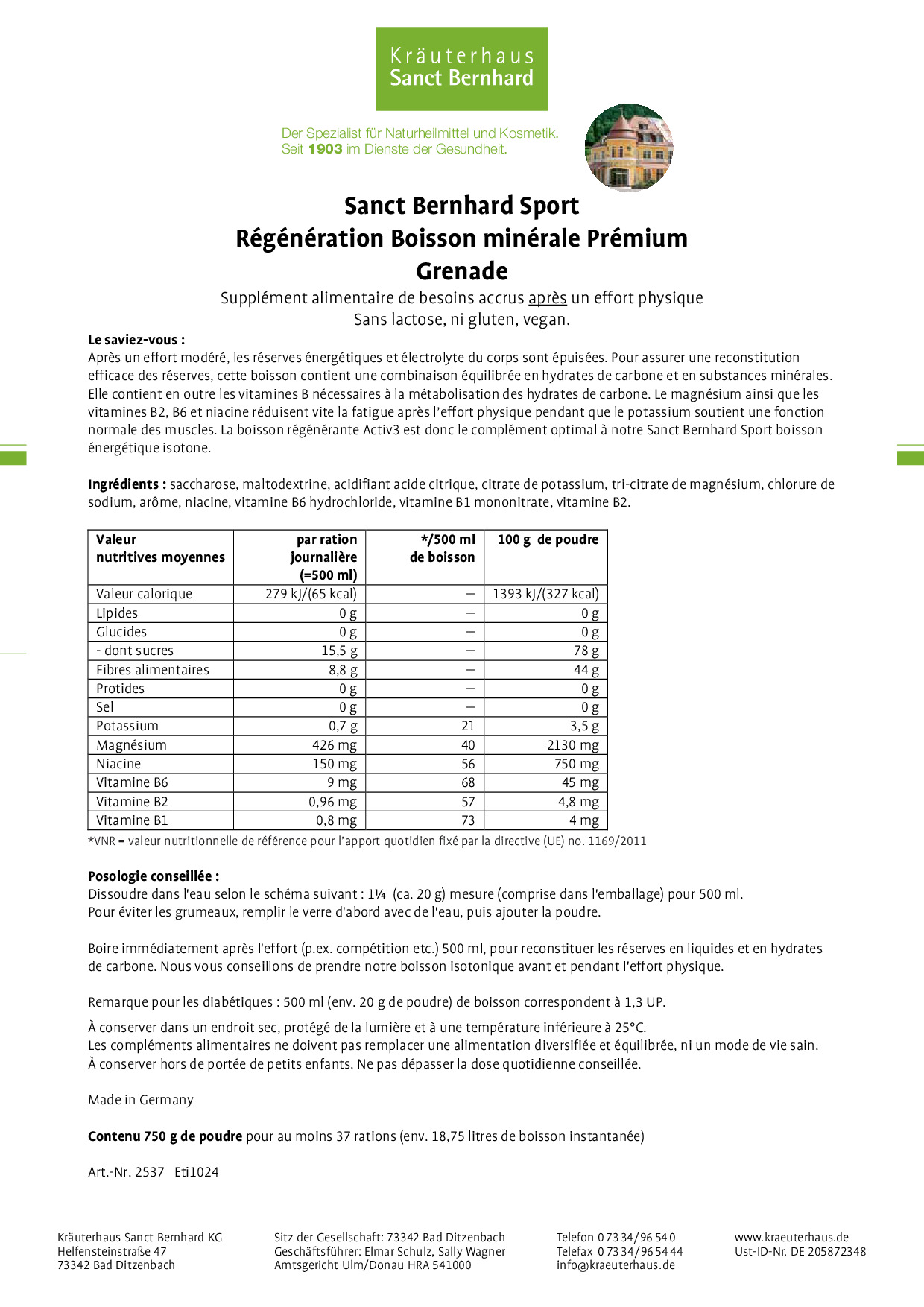 Remarque pour les diabétiques : 500 ml (env. 36 g de poudre) de boisson correspondent à 2,6 UP.